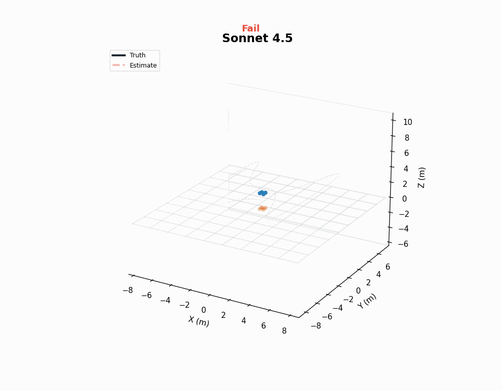While this functionality is certainly well represented in LLM training data, it covers a large chunk of what estimation means in the drone context. In that sense, although this may not fully stress the estimation capabilities of LLMs, to the extent that we care about the ability of LLMs to develop a drone autonomy stack, no harder benchmark is necessary!